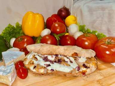Pain maison, sauce tomate, oignons, kebab, mozarella, sauce blanche |