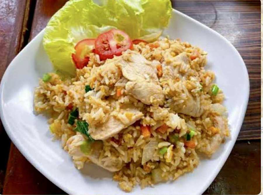 Riz frie Thaï (poulet ou boeuf Poulet sauté au gingembre Poulet curry vert avec du riz Poulet ou poisson curry rouge avec du riz Le poulet TomYum Beignets crevettes et porc par 4 |